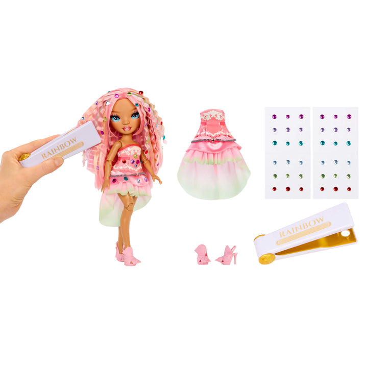- WHAT’S INCLUDED. 11” fashion doll, pink couture-inspired outfit, shoes, bedazzling tool, sparkling gems, and styling accessories.
